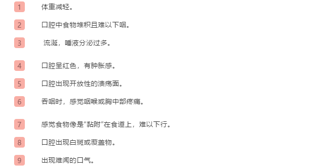 吞咽困難是指患者無(wú)法將食物或水通過(guò)咽喉下送。當(dāng)努力吞咽時(shí),患者可能會(huì)出現(xiàn)嘔吐、咳嗽、流涎或明顯疼痛感。導(dǎo)致吞咽困難的病因有多種,除針對(duì)咽喉或胸部放療和化療所產(chǎn)生的短期不良反應(yīng)外,口腔感染(如鵝口瘡)或食道感染也是常見(jiàn)病因。